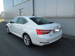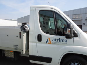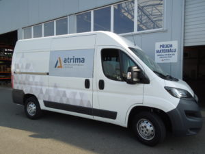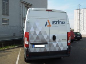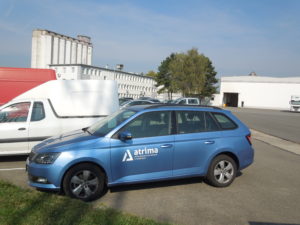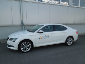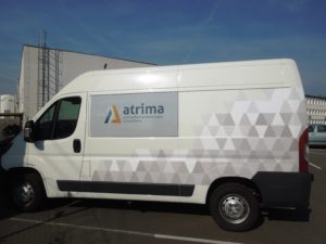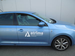 Unser orange-blaues Logo Atrima auf einem weißen Auto ist schon von weitem zu sehen.