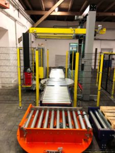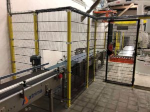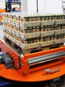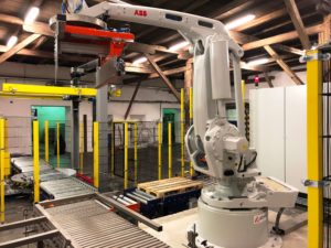 VÝKONNÁ ROBOTICKÁ PALETIZACE SKUPINOVÉHO BALENÍ plechovek a kartonů s příslušnými dopravníky, napojující se na linku doplněnou ovíječkou s horním překryvem.